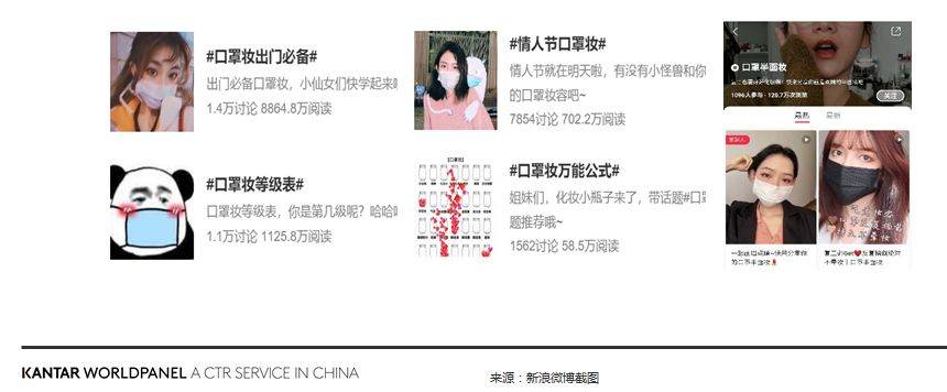 当然,冲击之下仍有曙光,年轻消费者因为新一代的工作方式和社交方式,比如视频会议/视频约会,或是在社交媒体上的自拍和直播,还是会保持一定的化妆次数;另外,不少精致女性还会画上着重眼部妆容打造的“口罩妆”,微博上“口罩妆出门必备”的话题截至2月20日,达到了1.4万讨论和8865万次的阅读。
