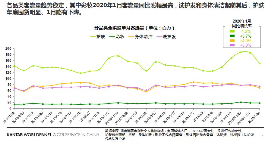 根据凯度消费者指数个人美妆样组数据显示,直至疫情全面爆发前的1月份,整体美妆个护的全渠道客流量表现较为稳定;每年3月、年中、年末的节日点由电商带动、客流量增幅最大。从细分品类来看,护肤的客流量最大,而彩妆截至2020年1月的同比增幅最高。