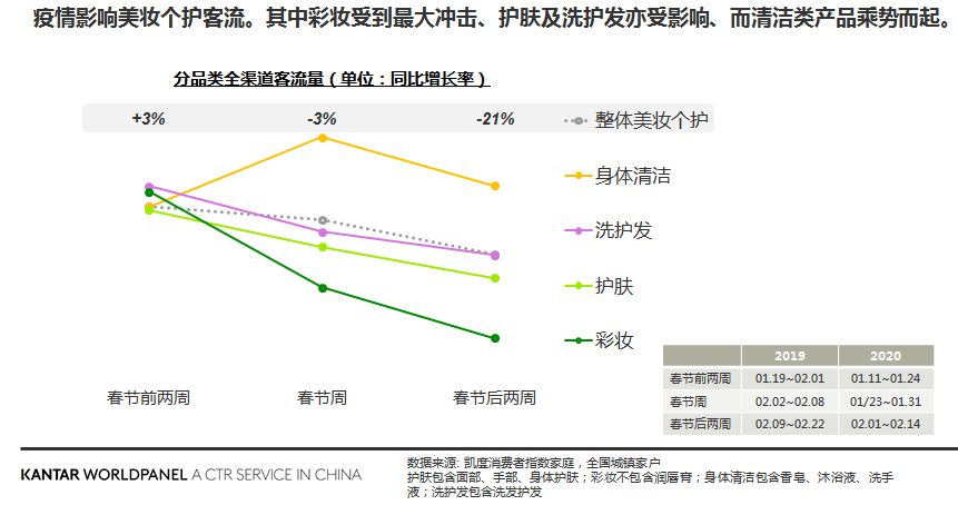 如果说洗护发虽然居家还是会保持一定的使用频率,那彩妆对于“宅在家里”的场景来说则显得没那么必要,春节后两周受到最大冲击。我们预测在疫情期间乃至结束后的一段时间内,面部防护仍将持续一阵子、彩妆回暖会较为迟缓。